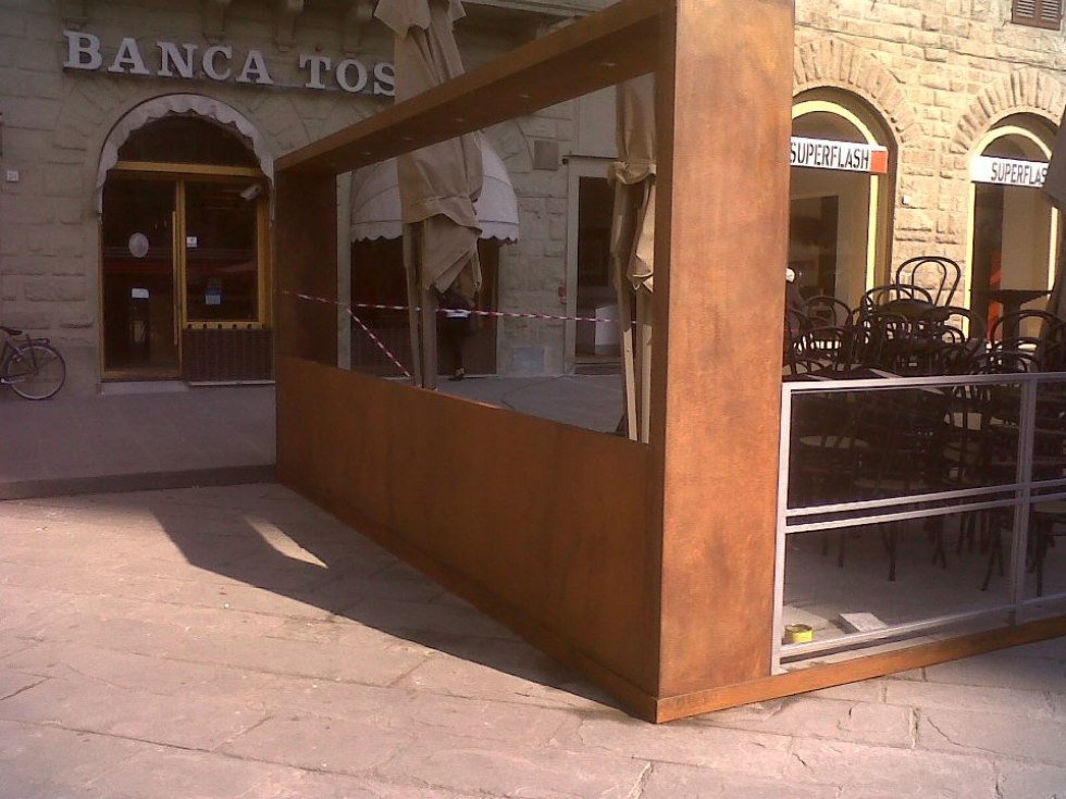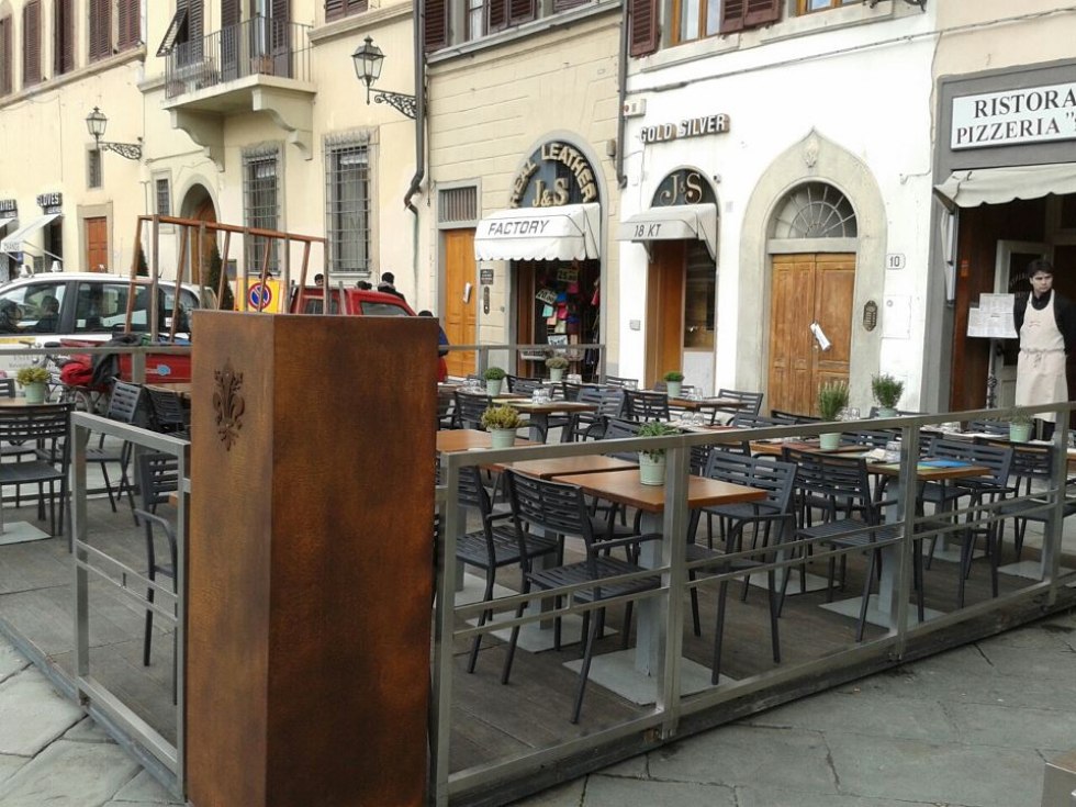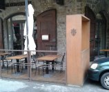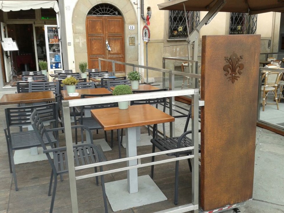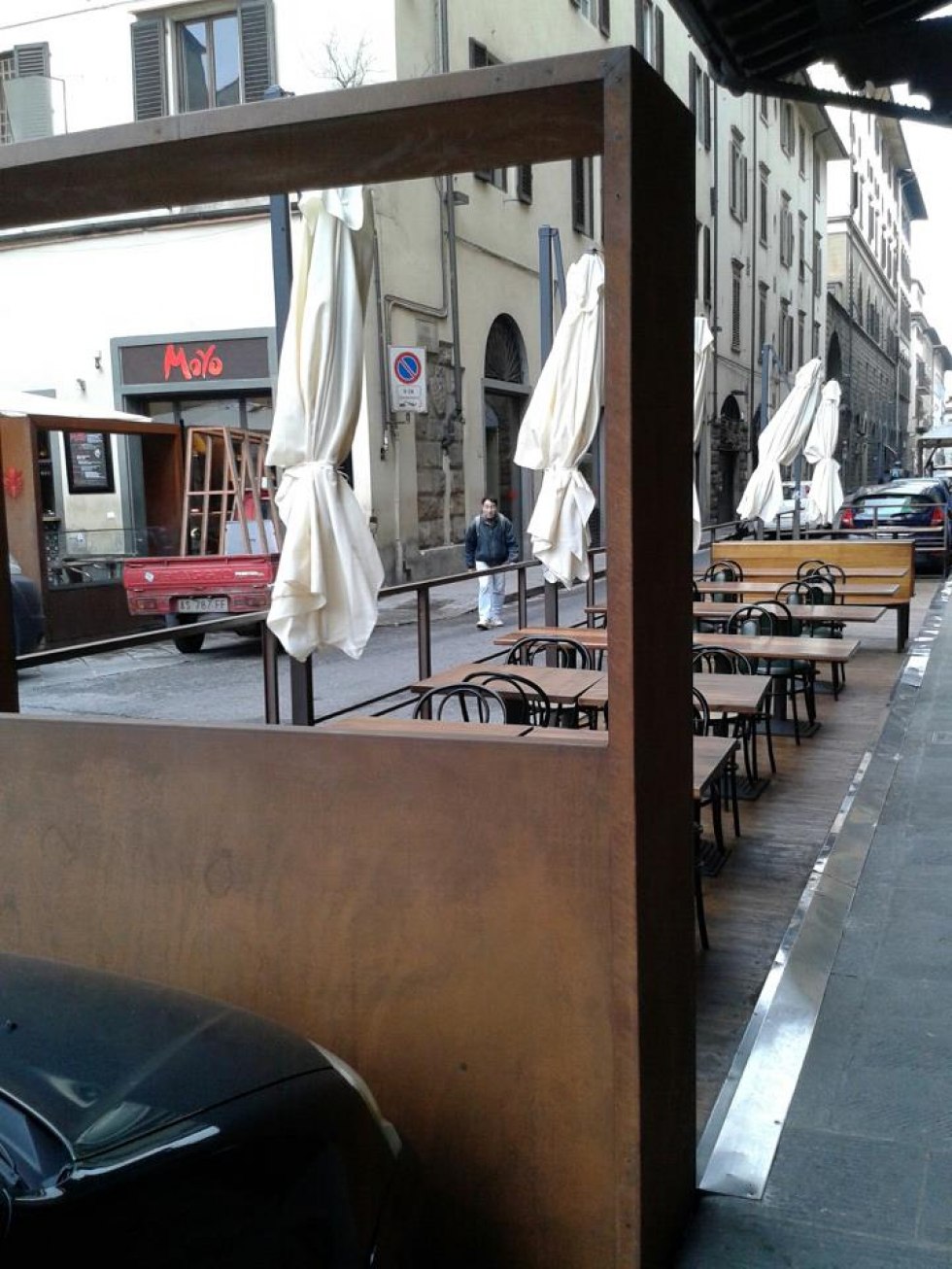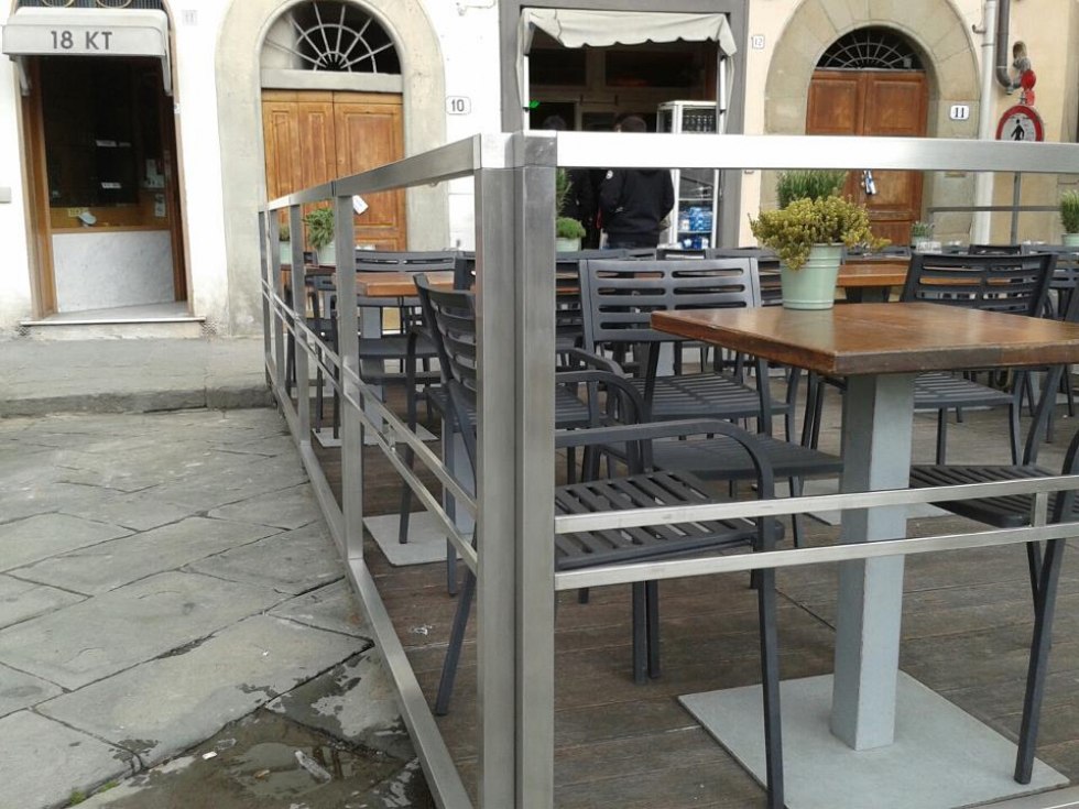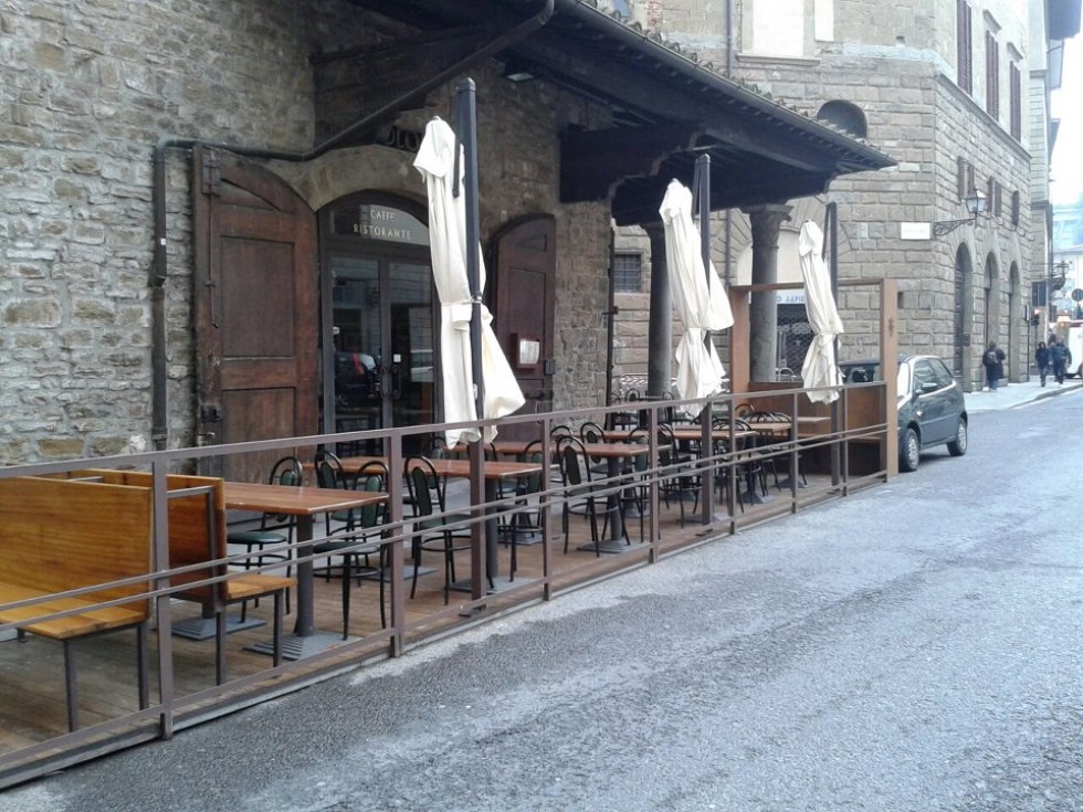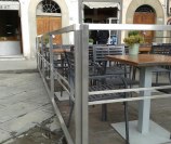 Dehor e pedane realizzati con struttura in ferro zincato con pavimentazione in legno/pietra/pvc effetto legno con ringhiere in ferro battuto, acciaio, vetro e copertura con ombrelloni o pensiline.