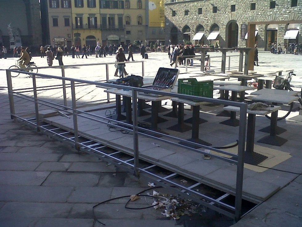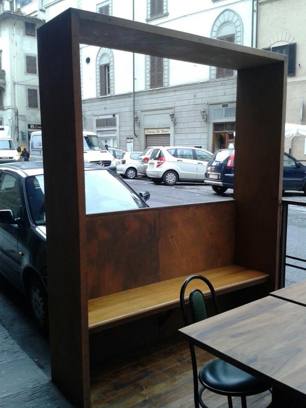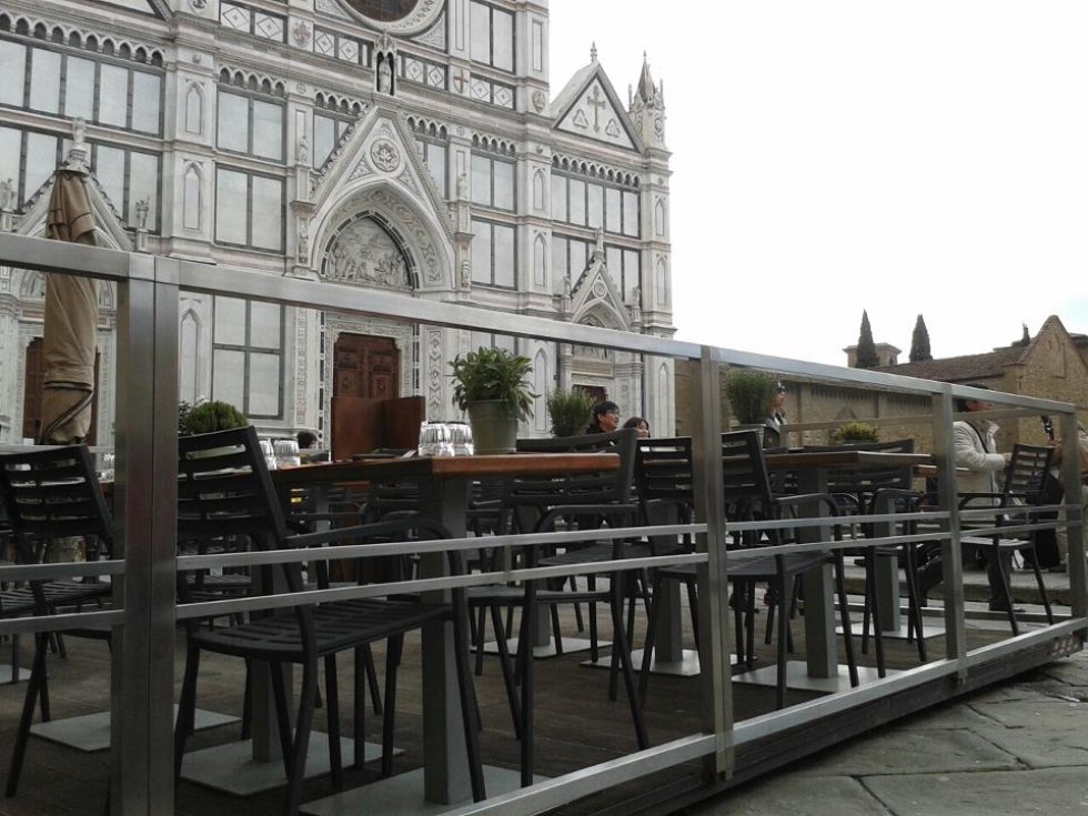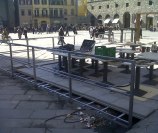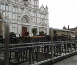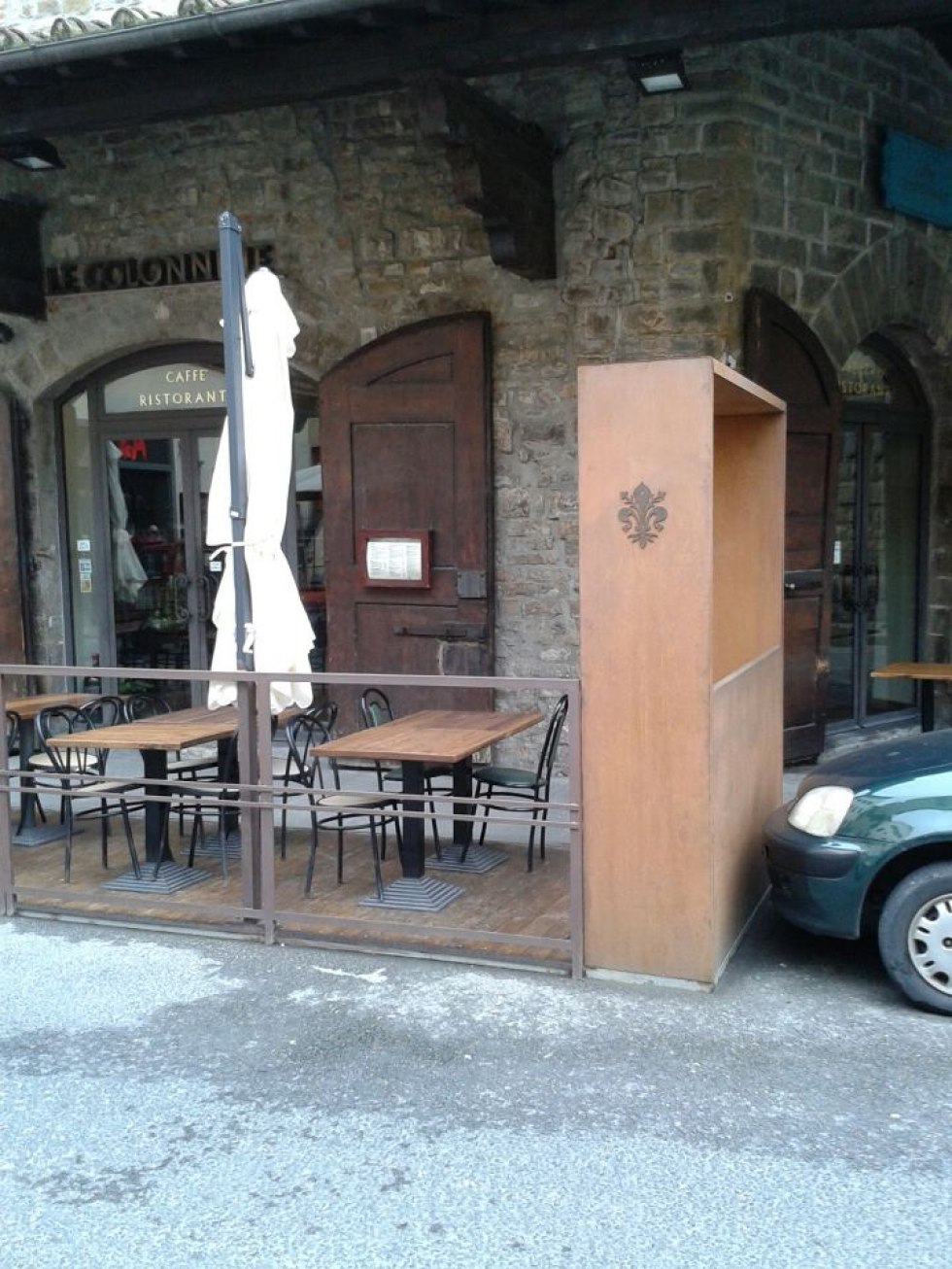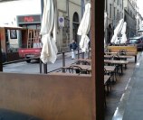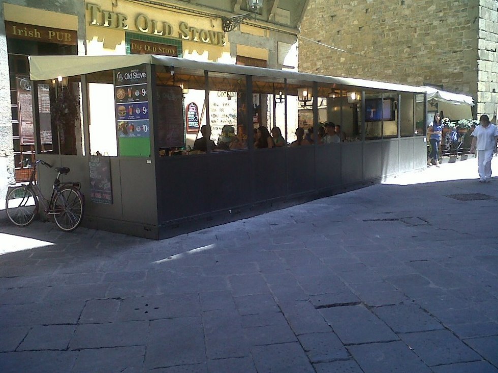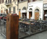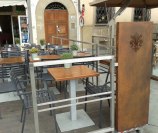 Dehor e pedane realizzati con struttura in ferro zincato con pavimentazione in legno/pietra/pvc effetto legno con ringhiere in ferro battuto, acciaio, vetro e copertura con ombrelloni o pensiline.